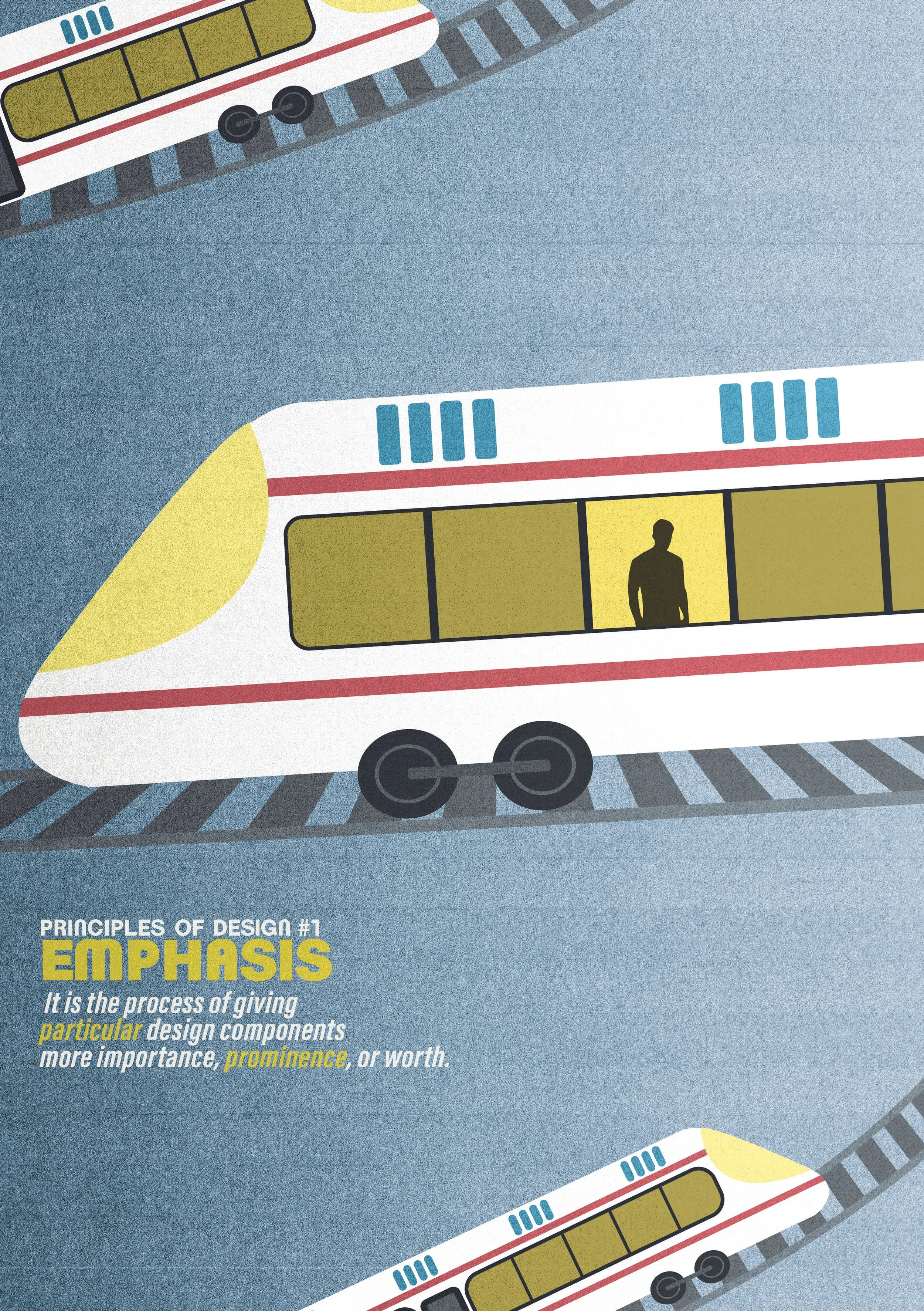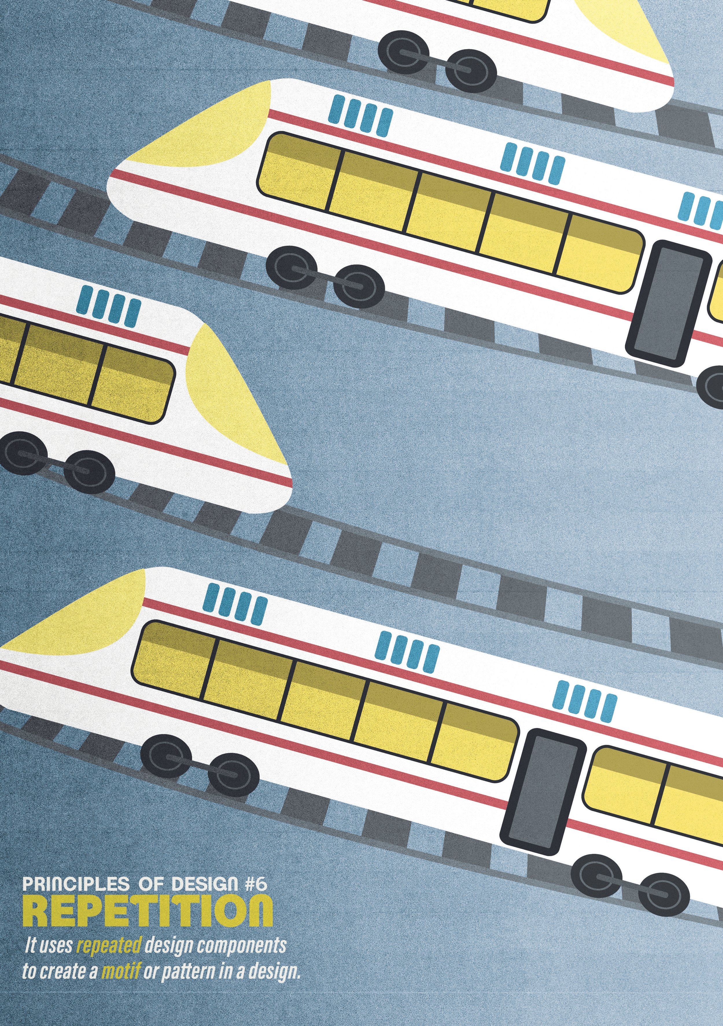 For the Repetition entry, I duplicated the main train unit and arranged them in a stacking, alternating pattern that travels the height of the entire poster.