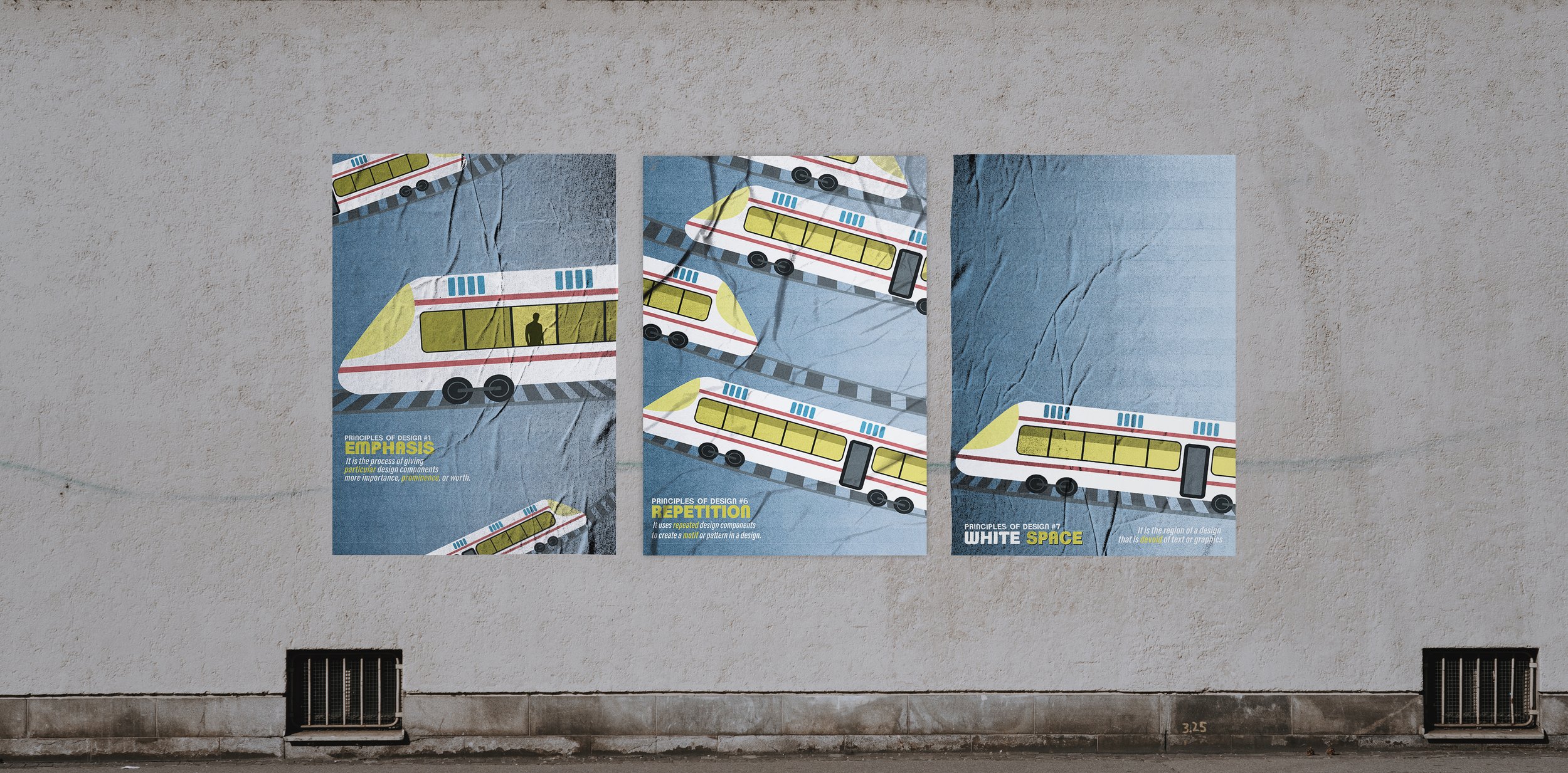 This series of three posters used a repeating design element, a modern train travelling on railroad tracks, as the cohesive unit to demonstrate the various principles of design with.