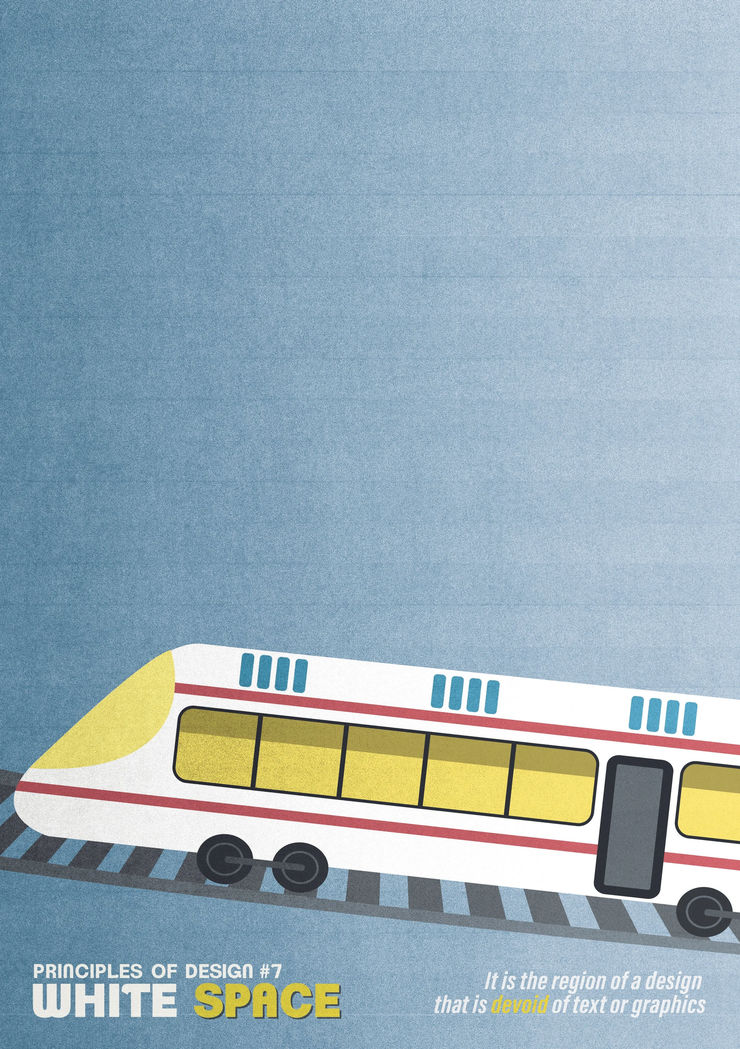 For the White Space entry, I let a single train sit on the tracks at the bottom on the poster, grounding the object in the scene and emphasizing the height in the negative space above the train. The lack of additional graphics illustrates the open area and draws focus to the train and information at the bottom in a similar method to the Emphasis entry.