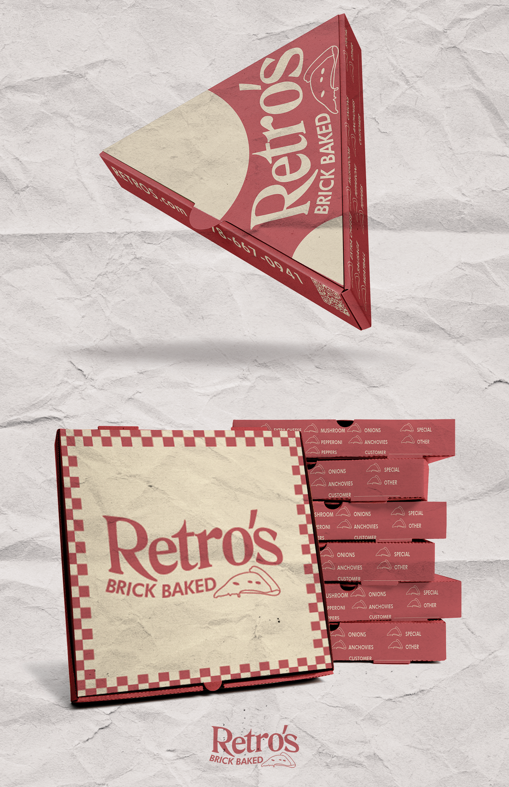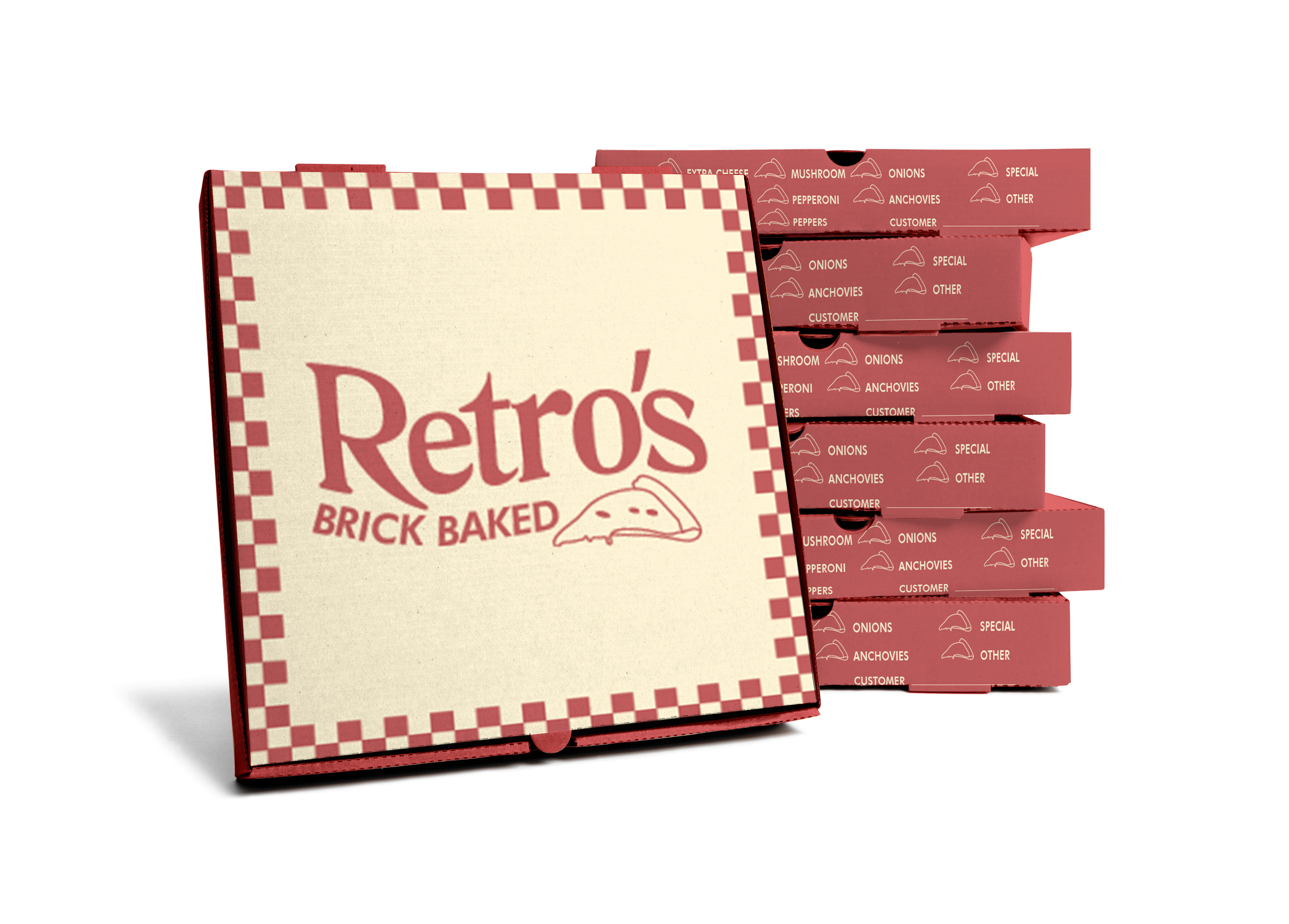 Retro's Brick Baked is a mock pizza brand I developed; This study of brand identity tried to capture the aesthetic of a classic Italian pizza brand, with a focus on presenting nostalgic 20th century American branding (calling back to the 1960's and the invention of the modern pizza box) while also maintaining a modern presentation.