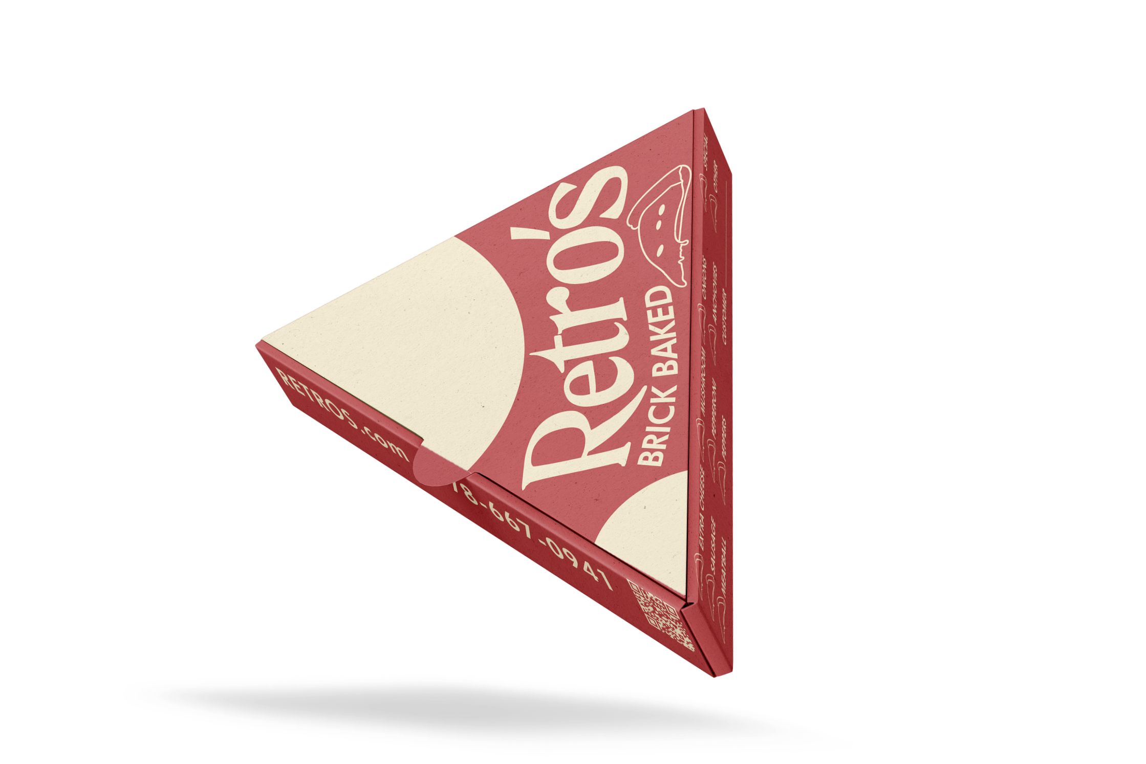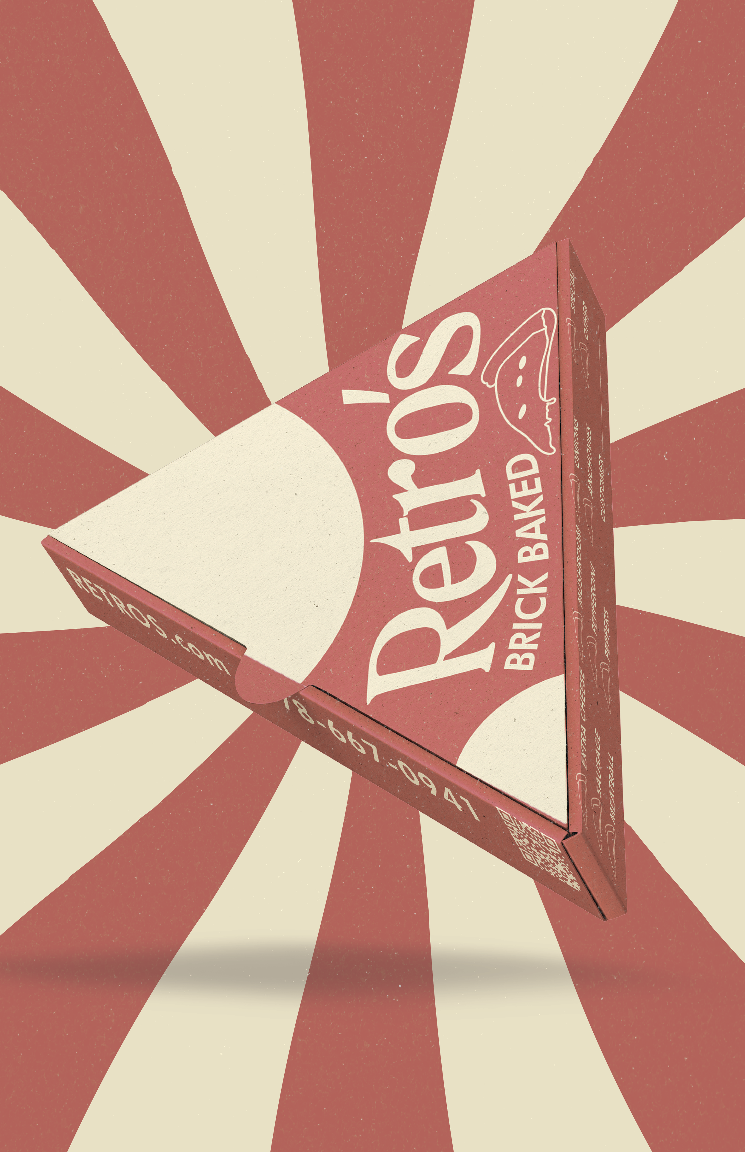 Retro's brand identity reflects the past, present, and future through its design. This is best shown through the single slice box; circular shapes abstractly represent the pizza's cheese drip over the box and break up the formality of conventional design/layout.